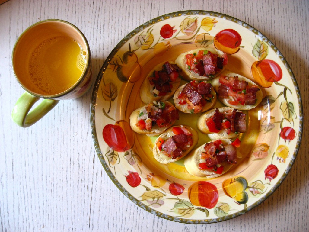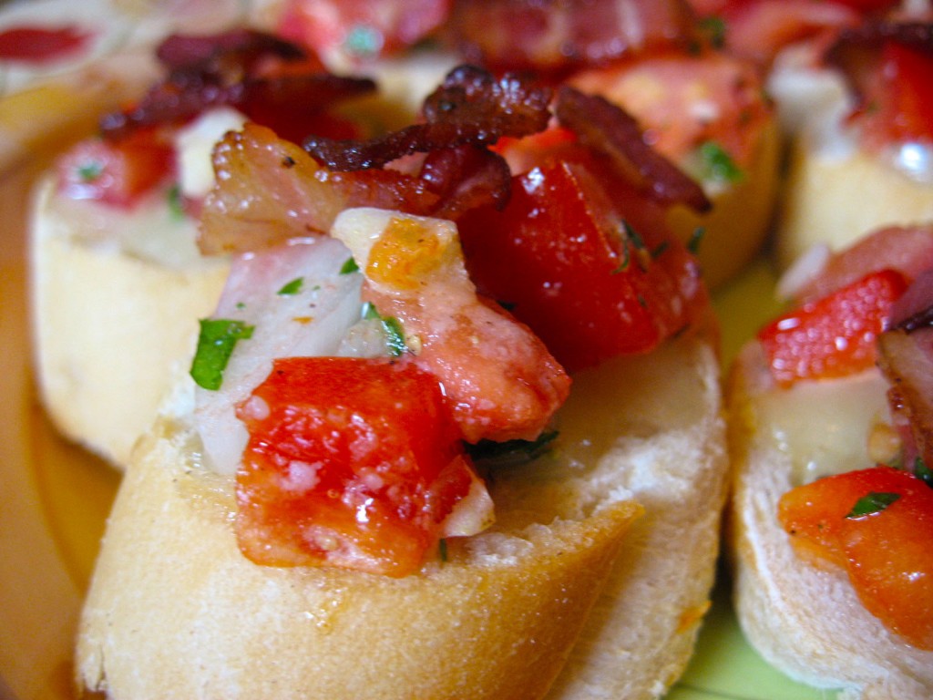 Grate the mozzarella cheese and layer on the toasted bread. Grated mozzarella melts a lot better than slices. Spoon the tomato mixture onto the toast. Top with cooked bacon bits or raw prosciutto (the prosciutto will crisp up nicely in the oven so no need to fry or cook up before hand). Let bake for 3-5 minutes (just until the cheese is bubbly). Remove from oven and serve immediatley.