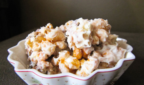 Melt 1 bag of white chocolate chips using a double boiler. Spread the melted chocolate all over the inside of the bowl (I found using a spachula for this worked best). Next, add your cooled caramel corn to the bowl of melted chocolate and mix.