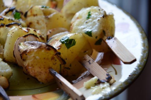 Thread the potatoes onto the skewers. Intertwine extra garlic slices and shallots if you like (as shown in photo). Place potato skewers on the grill over hot coals. Monitor the potatoes and flip once charred (roughly 3 minutes). After 5-7 minutes, remove from grill and let them cool for 1-2 minutes before serving.